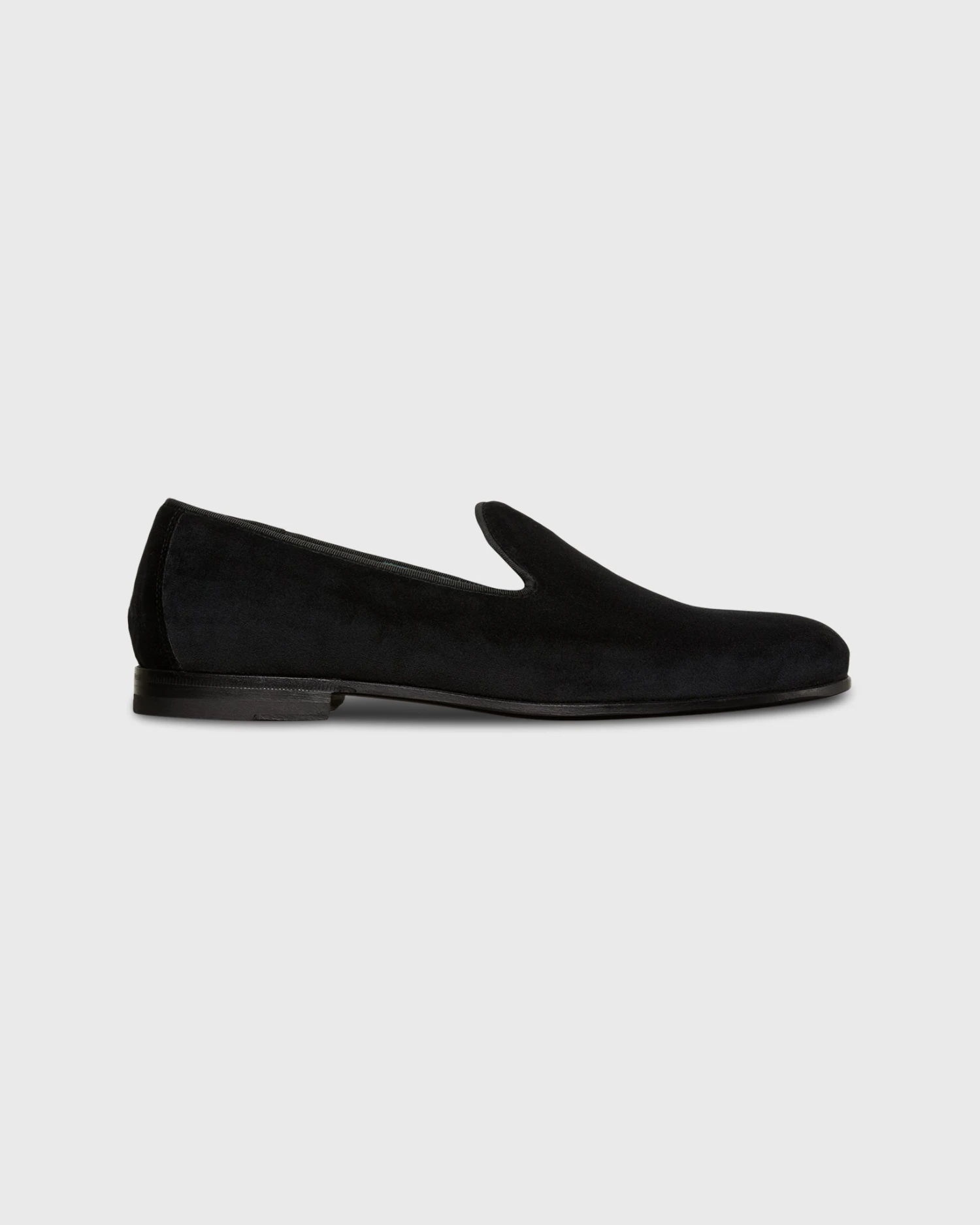 An elegant pair of evening slippers designed for black tie. They’re made in Italy from black velvet with grosgrain trim and a green calf leather lining… and they look killer with a tuxedo.