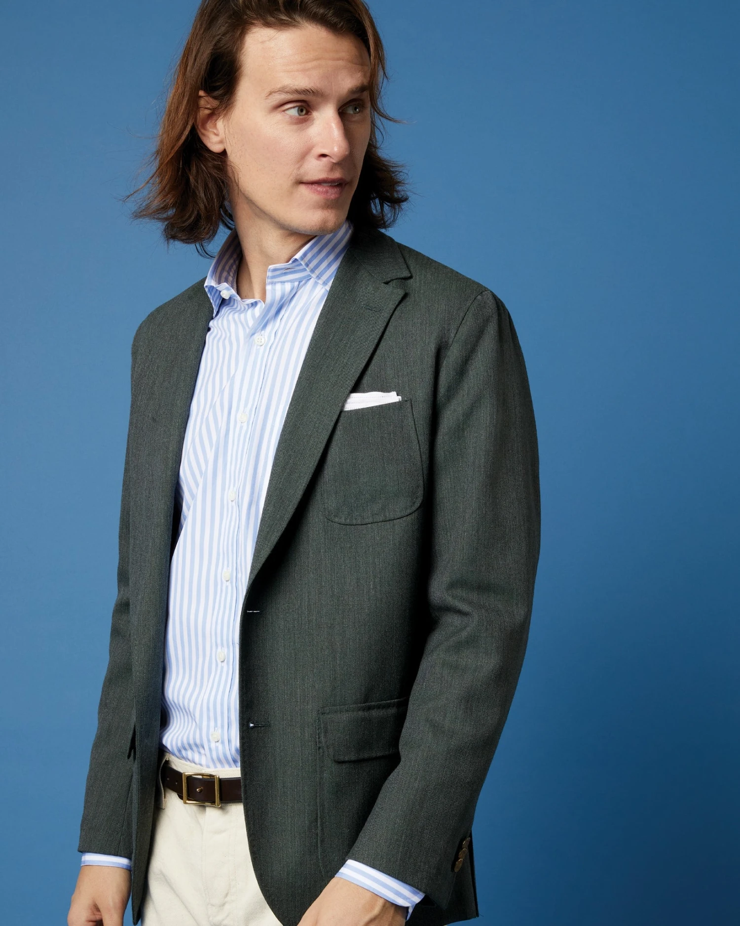 A special-edition, lovat green riff on the lightest, simplest tailored piece we’ve ever made. The Ghost is the blazer Sid’s been wearing twice a week since it launched. In fact, it’s one of β[his] favorite things we’ve ever made.β We took one of our all-time favorite suiting fabrics β 2ply high-twist wool from England β and used it for a jacket that’s totally unconstructed and stripped down. (Like a more dressed-up Butcher, if you’re keeping score at home.) No lining, no darts, pickstitched spalla camicia shirtsleeve construction, and these crazy, almost Surrealist-feeling buttons made of unlacquered brass. The pockets on the front are special, too: we designed them so that you can tuck in the flaps (without looking like you just tucked in the flaps) for a more open look. Fit-wise, it’s slim but still easy, just like our other jackets. Slip it on (or take it off and hold it up to the light) and you’ll see why we call it the Ghost… it’s so lightweight that it feels like wearing nothing at all. And, per Sid, you can dress it as far up or down as you want: βThe most elegant man in the world could wear it and a guy in a t-shirt could wear it.β