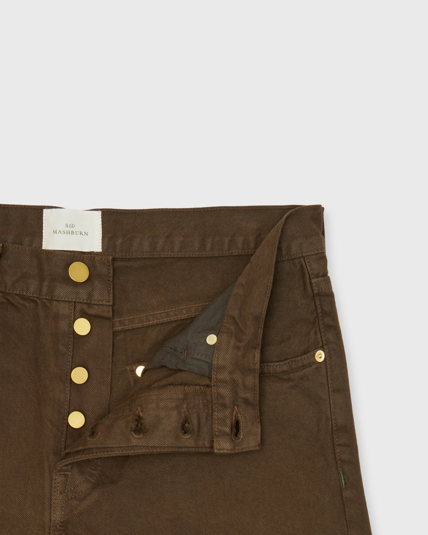 A quintessential pair of blue jeans, only garment-dyed to a rich shade shade of chocolate brown. The color’s easier to wear than you think, and pairs well with all shades of blue, light grey, earth tones… the list goes on. Just like all of our 5-pockets, the shape riffs on two other longtime favorites: think Levi’s 501s with more taper, APC New Standards with more room in the rise, and slimmer than both from the knee down. They’re made in Los Angeles with ring-ring Cone Mills denim, blue oxford pocketing, a button fly, brass rivets, chain-stitched hems, and clean, unbranded back pockets.